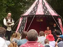 The Pentecôte du Roi Arthur is a medieval spectacle with jonglerie, storytellers, camps, storytelling, camps and other displays such as historical reenactment and living history.[39] As the name suggests, it coincides with the date of Pentecost. It is a celebration of spring and the adventures and encounters which it brings,[40] but most importantly (according to Ouest-France) it is an evocation of King Arthur's coronation day (as described by Robert de Boron in the 13th century) and his commitment to the Church. It was also on Pentecost that the Holy Grail appeared to the Knights of the Round Table.[41]