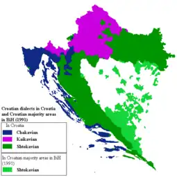 In the Middle Ages, on the territory of medieval Croatia formed three dialects; Chakavian, Western Shtokavian and Kajkavian.[42] Initially, the Chakavian dialect covered a much wider area than today: the major part of western-central and southern Croatia southwards of Kupa and westwards of Una river, bordering with the western and southwestern Bosnia and Herzegovina, including all the Eastern Adriatic islands northwest of Mljet, while substratum of Chakavian in Dalmatia possibly existed all the way to Dubrovnik.[43][22][44][45] Croatian dialectologist Petar Šimunović considered that all area until and with Dubrovnik was originally Chakavian.[44] The Dubrovnik area has phonology closer to Southern Chakavian than Eastern Shtokavian.[44] It is possible that some Chakavian idioms were also present in early medieval Montenegro and Albania.[46] However, linguists also point to the fact that it is not possible to draw historical border between Chakavian and Shtokavian, especially Western Shtokavian, with certainty.[47][43][28] According to Serbian linguist Pavle Ivić, "the question of where the border of these two dialects was in the Middle Ages is not quite appropriate".[48]