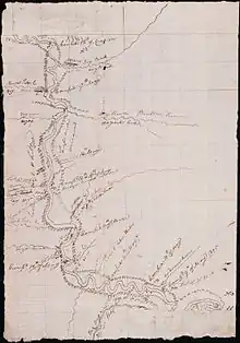 Two more near-disasters on May 17 led to the naming of additional features. William Clark was nearly bitten by a rattlesnake while exploring a creek on the northern side of the river. This creek was named Rattlesnake Creek (although today it is called Timber Creek). The party camped near a creek on the south side of the river that evening. Clark saw a fortified Native American lodge a short distance up the creek, believing it to be an Atsina (Gros Ventre) site. Late that night, a cottonwood tree sheltering the camp caught fire from sparks rising from the expedition campfire. The men were barely able to get out of their tent and pull it out of the way before the tree came crashing down on the site. Lewis named this Burnt Lodge Creek (although today it is known as Seven Blackfoot Creek).[34] On May 20, the expedition passed the Musselshell River.[35] On May 22, the party passed another creek, which they decided to name Sacajawea Creek.[36] (Later renamed Crooked Creek, the U.S. government formally changed the name back to Sacagawea Creek in 1979.)[37] The Corps of Discovery left the CMR NWF on May 24 or 25, after spending a week passing through and exploring the area.[38]