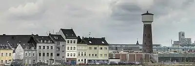On 24 May 1892, the Vorster & Grüneberg Kommanditgesellschaft was renamed into Chemische Fabrik Kalk GmbH (CFK) and converted into a company with limited liability (GmbH).[15] It was one of the first limited liabilities companies in the German Empire as the law on companies with limited liabilities was adopted only one month earlier. On 7 June 1894, the last surviving founder Hermann Julius Grüneberg dies. His son Richard Grüneberg succeeds him and joins the management board of the company.[8] After 1900, the production of potassium carbonate ceased due to competitive pressure. Instead, the company began to produce sodium carbonate using the Solvay process. In 1902, the Düngerfabrik C. Scheibler & Co. was incorporated, and a year later the last remaining factory in the Staßburg region, the potassium chloride factory in Leopolshall was sold. To guarantee the water supply in the main factory in Kalk a water tower with an integrated chimney and a height of 43.6 metres (143 ft) was built. This water tower should dominate the skyline of Kalk for the next one hundred years.[16]