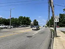 When the Sproul Road Bill was passed in 1911, the road between Chester and Philadelphia was legislated as part of Legislative Route 180 and as Legislative Route 150 between Philadelphia and Morrisville.[16] With the creation of the U.S. Numbered Highway System in 1926, US 13 was designated through Pennsylvania from the Delaware border in Marcus Hook northeast to US 1/PA 1 at Bridge Street in Morrisville.[17] The route followed Post Road between Marcus Hook and Chester, Chester Pike between Chester and Darby, and Main Street through Darby before it reached Philadelphia. This route effectively replaced part of the Capitol Trail, an auto trail connecting Philadelphia and Atlanta via Washington, D.C.[18][19] US 13 passed through Philadelphia along Woodland Avenue, Market Street, Broad Street, Diamond Street, Front Street, Kensington Avenue, and Frankford Avenue. The route continued into Bucks County and followed Bristol Pike to Morrisville, where it headed north on Philadelphia Avenue and Pennsylvania Avenue to US 1. In Philadelphia, US 13 ran concurrent with US 1 on Woodland Avenue north of Baltimore Avenue, US 1 and US 30 on Market Street and Broad Street north to Vine and Race streets, and US 1 on Broad Street between Vine Street and Diamond Street.[17][20][21] US 13 was originally designated concurrent with PA 91 between the Delaware border and Philadelphia and with PA 32 between Philadelphia and Morrisville, where that route continued north along the Delaware River.[22] In 1928, the concurrent PA 91 and PA 32 designations were removed.[23]
