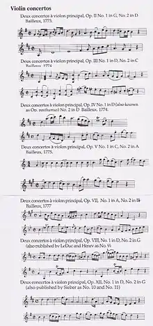 Saint-Georges's first composition Op. I, probably composed in 1770 or 1771, was a set of six string quartets, among the first in France, published by famed French publisher, composer, and teacher Antoine Bailleux.[37] He was inspired by Haydn's earliest quartets, brought from Vienna by Baron Bagge. Also in 1770, Carl Stamitz dedicated his own set of six string quartets to Saint-Georges.[38] By 1771, Gossec had appointed Saint-Georges as the concert master of the Concert des Amateurs.[39]