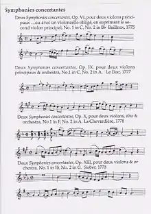 - L'Amant anonyme (The Anonymous Lover), comédie mélée d'ariettes et de ballets, in 2 acts, after a play by Mme. de Genlis, première in Paris, Théâtre de Mme. de Montesson, 8 March 1780, complete manuscript in Paris Bibliothèque Nationale, section musique, côte 4076. The first critical edition of this, his lone surviving opera, was prepared by Opera Ritrovata for streaming performance by Los Angeles Opera and the Colburn School in November 2020.[190] In June 2022 this work was performed by the Haymarket Opera Company in Chicago, Il. The opera was subsequently recorded by Cedille Records and features the soprano Nicole Cabell.[191][192]