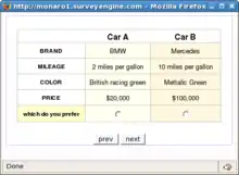 • Alternatives: A number of hypothetical alternatives, Car A and Car B in this example. There may be one or more Alternatives including the 'None' Alternative.