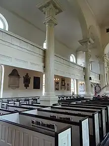 When the congregation outgrew the original building twenty years after its construction, they decided to erect a new church, the most sumptuous in the Thirteen Colonies. The main body of the church was constructed between 1727 and 1744, and the steeple was added in 1754, making it the tallest building in the future United States, at 196 feet (60 m).[5] Christ Church is considered one of the nation's most beautiful surviving 18th-century structures, a monument to colonial craftsmanship and a handsome example of Georgian architecture. Modeled on the work in London of Christopher Wren,[1] it features a symmetrical, classical façade with arched windows and a simple yet elegant interior with fluted columns and wooden pews. Although the architect of the church is unknown, its construction was supervised by John Kearsley, a physician, who was likely also responsible for the design, possibly with John Harrison.[1][6] The church was rebuilt in 1777 by Robert Smith, and the interior was altered in 1883 by Thomas Ustick Walter.[6]