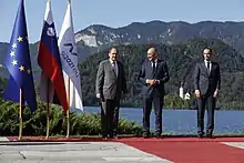 Schmidt alongside Slovenian Prime Minister Janez Janša (centre) and Foreign Minister Anže Logar, 1 September 2021