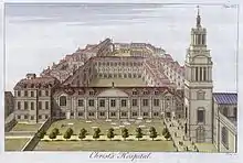 Christ's Hospital was the result of the foundation by Henry VIII and confirmed by Edward VI, assisted by Nicholas Ridley, Bishop of London, and Sir Richard Dobbs, Lord Mayor of London.[6] Its genesis was the earlier dissolution of the monasteries and the resultant overflow onto the streets of the poor and destitute. Encouraged by a sermon from Ridley, exhorting mercy to the poor, the king wrote to the Lord Mayor encouraging him to action. This he did via a committee of 30 merchants. Henry VIII had already granted the use of Greyfriars to the city for the relief of the poor and to house the homeless children which the magistrates had taken notice of.[7] Edward granted Bridewell Palace, his lands at the Savoy, and rents and other chattels to create three Royal Hospitals – Bridewell Hospital (now the King Edward's School, Witley, Surrey), St Thomas' Hospital and Christ's Hospital, which was for the education of poor children.