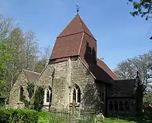 Church in the Wood, officially known as St Leonard's Church and originally as St Rumbold's Church, is an Anglican church in the Hollington area of the town and borough of Hastings, one of six local government districts in the English county of East Sussex. Although Hollington is now a large suburb, consisting mostly of postwar residential development, the church has stood in isolation in the middle of an ancient wood since it was founded in the 13th century—almost certainly as the successor to an 11th-century chapel. Restoration work in the Victorian era has given the Early English Gothic-style building its present appearance, but some medieval work remains. Legends and miraculous events have been associated with the church, and its secluded situation has been praised by writers including Charles Lamb. The church is a Grade II Listed building.