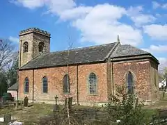 The tower is built of red sandstone, the nave and chancel of brick, with roofs of large grey slates. The tower has three stages with a 19th-century west door in a medieval arch, above which is a window with two lights. The top of the tower is battlemented. The plan of the body of the church consists of a four-bay nave and a one-bay chancel, and a lean-to vestry to the north of the tower.[1] The tower is in Perpendicular style. The nave windows are wide and slightly pointed; those in the chancel are lancets.[4]