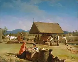 In 1682, Governor Carteret of New Jersey wrote, "At Newark is made great quantities of syder, exceeding any that we have in New England, Rhode Island, or Long Island". A thousand hogsheads (238,481 liters) were filled that year in Newark.[13] Around this time it became a trend to breed versatile apples that would go well with a joint of pork, could be peeled and baked in a pie or rendered into apple butter, but also had enough juice to ferment into alcohol[14] and could be pressed into cider come autumn harvest.[15] Unbeknownst to the British settlers of central colonies and Appalachia, it is likely some of the cultivars brought by Germans and Swedes introduced genetics that were much hardier to cold weather than the stock they possessed. The crossbreeding of these on other settler's lands via pollination introduced genetics that were very valuable to climates like Southern Appalachia. Ultimately the result of the mixed heritage of the Americas was a motley foundation stock from all over Northern Europe, resulting in seedlings and breeds of mixed provenance, such as the Harrison Cider Apple, Rambo, Black Gilliflower, Newtown Pippin, Green Cheese, and Baldwin. Many of these older apples are still used in cookery and in cider making even in the present day.[16][17]