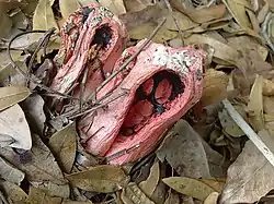 Before the volva opens, the fruiting body is egg-shaped to roughly spherical, up to 6 cm (2.4 in) in diameter, with a gelatinous interior up to 3 mm (0.1 in) thick. White to grayish in color, it is initially smooth, but develops a network of polygonal marks on the surface prior to opening as the internal structures expand and stretch the peridium taut.[21] The fruit body, or receptacle, bursts the egg open as it expands (a process that can take as little as a few hours),[6] and leaves the remains of the peridium as a cup or volva surrounding the base.[21] The receptacle ranges in color from red to pale orange, and it is often lighter in color approaching the base. The color appears to be dependent upon the temperature and humidity of the environment.[22] The receptacle consists of a spongy network of "arms" interlaced to make meshes of unequal size. At the top of the receptacle, the arms are up to 1.5 cm (0.6 in) thick, but they taper down to smaller widths near the base. A cross-section of the arm reveals it to be spongy, and made up of one wide inner tube and two indistinct rows of tubes towards the outside. The outer surface of the receptacle is ribbed or wrinkled.[21] There are between 80 and 120 mesh holes in the receptacle.[23] The unusual shape of the receptacle has inspired some creative comparisons: David Arora likened it to a whiffleball,[22] while the German Mycological Society—who named C. ruber the 2011 "Mushroom of the Year"—described it as "like an alien from a science fiction horror film".[24]