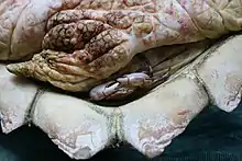 | Caribbean and Indo-Pacific coral reefs | Crab Planes minutus | Eat ectoparasites while living on host | Loggerhead sea turtle (Caretta caretta)[6][16] | ![]() |
