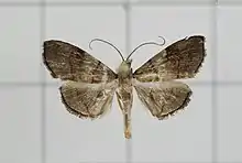 The wingspan is 21–26 mm.[4] The wings are fuscous cinereous (ash gray) with a slight purplish gloss. The transverse lines are dark brown.[5]