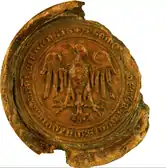 The design of the coat of arms had originated from the seal used by Siemowit III, Duke of Masovia, in 14th century, that depicted an eagle with raised wings, and its head facing left. From 1370 to 1381, duke Siemowit III was a sole ruler of the Duchy of Masovia.[4] In 1381, the state had been partitioned by the sons of Siemowit III.[5] In such division, the areas under the control of duke Siemowit IV, the duchies of Płock, and Rawa, continued using the design of the seal of their father, as a coat of arms with white (silver) eagle on a red background.[6] At the same time, Janusz I of Warsaw, duke of the Duchy of Warsaw, begun using the coat of arms divided into 4 equal fields, with top left and bottom right fields were white, with a red dragon on them, while top right and bottom left fields were white with a red eagle on them.[7] The design of the coat of arms with a white (silver) eagle on a red background continued being used as a symbol Masovian duchies until 1526, when the area was incorporated into the Crown of the Kingdom of Poland, where it was rearranged into the Masovian Voivodeship.[8] The voivodeship continued using the similar design of the coat of arms, until 1795, when it ceased to exist in the Third Partition of Poland.[3][9][10]