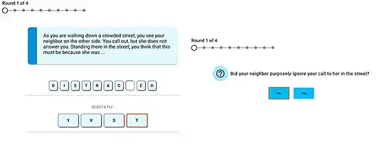 To see whether the ambiguous situations paradigm is successful in modifying interpretation bias, a "recognition" task that consists of a series of ambiguous scenarios is typically used as an outcome measure.[11] In this task, the scenarios remain ambiguous even after solving the word fragment—for example, "You ask a friend to look over some work you have done. You wonder what he will think about what you've written. He comes back with some comments on a Thur_day [word fragment in italics]." In the second part of the recognition task, the titles of the ambiguous scenarios are displayed, together with four sentences per scenario that reflect different ways of understanding what occurred in the scenario that weren't actually stated. These sentences represent: a) a possible positive interpretation tied to the key emotional meaning of the scenario, b) a possible negative interpretation tied to the key emotional meaning of the scenario, c) a positive sentence that is not tied to the key emotional meaning of the scenario, and d) a negative sentence that is not tied to the key emotional meaning of the scenario. Individuals rate each sentence for its similarity in meaning to the original scenario. Higher similarity ratings for the positive (vs. negative) interpretation tied to the key emotional meaning of the scenario are thought to reflect a more positive interpretation.