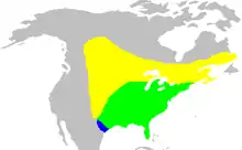 | Approximate range in North America Breeding range Year-round range Wintering range | |