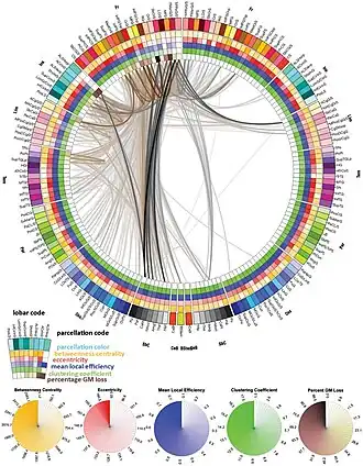 Connectograms are circular, with the left half depicting the left hemisphere and the right half depicting the right hemisphere. The hemispheres are further broken down into frontal lobe, insular cortex, limbic lobe, temporal lobe, parietal lobe, occipital lobe, subcortical structures, and cerebellum. At the bottom the brain stem is also represented between the two hemispheres. Within these lobes, each cortical area is labeled with an abbreviation and assigned its own color, which can be used to designate these same cortical regions in other figures, such as the parcellated brain surfaces in the adjacent image, so that the reader can find the corresponding cortical areas on a geometrically accurate surface and see exactly how disparate the connected regions may be. Inside the cortical surface ring, the concentric circles each represent different attributes of the corresponding cortical regions. In order from outermost to innermost, these metric rings represent the grey matter volume, surface area, cortical thickness, curvature, and degree of connectivity (the relative proportion of fibers initiating or terminating in the region compared to the whole brain). Inside these circles, lines connect regions that are found to be structurally connected. The relative density (number of fibers) of these connections is reflected in the opacity of the lines, so that one can easily compare various connections and their structural importance. The fractional anisotropy of each connection is reflected in its color.[1]