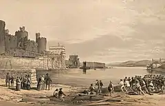 During May 1846, groundwork for the bridge commenced.[2] On either shore, the underlying bedrock was levelled close to the river's low water level for the foundations of the towers. For additional support, timber piles were driven at the south east corner of Conwy Tower where the masonry is seated on a wooden platform roughly 600mm below the low water level.[2]