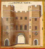 The origins of the gate's name are unclear.[3] One theory, bolstered by a mentioning of the gate in the fourth law code of Æthelred the Unready and a charter of William the Conqueror from 1068 under the name "Crepelgate",[4] is that it takes its name from the Anglo-Saxon word crepel, meaning a covered or underground passageway.