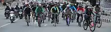 The Critical Mass rides have inspired a number of other bicycle movements, that range from political movements to the "Critical Tits" ride during the yearly Burning Man festival.[20] In Chicago, a movement has grown out of the Critical Mass community to promote winter cycling via the Bikewinter campaign.[21] The extensive news coverage of San Francisco's July 1997 ride spawned an international celebration of bicycling, called Bike Summer.[22] Kidical Mass originated in Oregon, and encourages bicycle riding for children and families.[23] The movement gained momentum in North America and Europe and set a record in September 2019, when 1100 riders took part in Dortmund, Germany.[24] "Critical Sass" was an all-female version of the ride in Baton Rouge, Louisiana, that took place the second Friday of every month. The Tweed Run (along with various other vintage bike rides) is a well dressed mass which takes place annually in a number of cities across the world. Examples of Critical Mass rides for political movements includes the Free Tibet Rides (May 2008): Free Tibet Critical Mass in Columbia, Missouri, "Tibetan Freedom Bike Rally" in San Francisco (Aug 2008), and in "Bike Ride for Tibet" in London (Aug 2008).[25]