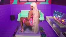 BlameItonKWay, who appears first in the video has a waist-length turquoise wig with top knots and a crown of braids.[26] Megan sports various toy-inspired looks, including a yellow racetrack jumpsuit, a pink Barbie doll bikini with blue flowers, and a floral hula girl outfit.[15] In between scenes, she also has a bouquet-like headpiece on top of her hair, a pastel pink waist-length hairdo, and black pigtails with a zig-zag middle part. The dancers wear heavy eyelashes, electric blue eyeshadow, winged liner, and subtle rhinestones to match Megan's bedazzled floral nails.[26] The 50-inch long platinum, pastel-coloured floral look two hours to hand-paint with a stencil. The hairstylist was aiming for a "Malibu Barbie"-look.[40]