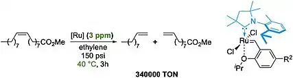 As ligand for transition metal catalysts, CAAC-Ru complexes catalyze ethenolysis.[14] Note that this was the first time ruthenium metathesis catalysts exhibited high performance in cross‐metathesis reactions employing ethylene gas, with activities sufficient for the industrial‐scale production of linear α‐olefins (LAOs) and other terminal‐olefin products.