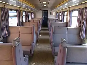 The class MR is an adaptation of the German class 628.0[6] and was first delivered in 1978. The trains were initially coupled as MR–MR carriages back-to-back. Starting in 1981, the class MRD was introduced to better accommodate passengers' luggage, and from then on the MR–MRD formation has been used.[7] The trainsets can run in multiple, with up to five carriage pairs in a train having been used.[8]