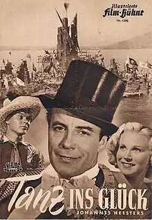 Dance into Happiness (German: Tanz ins Glück) is a 1951 Austrian musical comedy film directed by Alfred Stöger and starring Johannes Heesters, Lucie Englisch and Waltraut Haas.[1] It is an operetta film, based on Whirled into Happiness composed by Robert Stolz. It was shot in Agfacolor. It was made at the Tempelhof Studios in West Berlin and on location around Bregenz and nearby Lake Constance in Vorarlberg. The film's sets were designed by the art director Gabriel Pellon. It premiered on 20 October 1951 in Hanover and was not released in Austria until its release in Vienna on 26 February 1952.