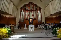 At 6:36 am on 14 August, the casket carrying Lee's remains was moved from Taipei Veterans General Hospital to Che-lam Presbyterian Church, where Lee's private funeral took place behind closed doors. At the start of ceremony, the bell was rung for 21 times, in an adaptation of the 21-gun salute in Western state funerals.[22] The service was presided over by pastors Iap Khe-siong and Ng Chhun-seng. During the service, the Taiwanese Hokkien version of Lee's favourite hymns "Amazing Grace" and "Rock of Ages, cleft for me" were sung.[23][24] Around 100 people, including 60 family members, some government officials and clergymen, attended the service but Lee's widow, Tseng Wen-hui, was absent over concern for her health.[22]