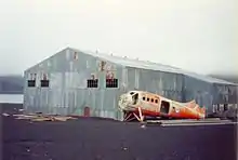 Remains of previous structures at Whalers Bay include rusting boilers and tanks, an aircraft hangar, and the British scientific station house (Biscoe House), with the middle torn out by the 1969 mudflows. A bright orange derelict airplane fuselage, which is that of a de Havilland Canada DHC-3 Otter that belonged to the Royal Air Force, was recovered in 2004. Plans to restore the airplane and return it to the island have been made.[26]