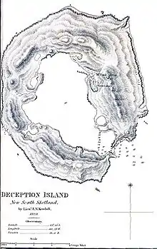 The first authenticated sighting of Deception Island was by the British sealers William Smith and Edward Bransfield from the brig Williams in January 1820. It was first visited and explored by the American sealer Nathaniel Palmer on the sloop Hero the following summer, on 15 November 1820. He remained for two days, exploring the central bay.[11] Palmer named it "Deception Island" on account of its outward deceptive appearance as a normal island, when the narrow entrance of Neptune's Bellows revealed it rather to be a ring around a flooded caldera.[12][13]