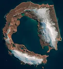Deception Island is in the South Shetland Islands close to the Antarctic Peninsula with a large and usually "safe" natural harbor, which is occasionally affected by the underlying active volcano.[1] This island is the caldera of an active volcano, which seriously damaged local scientific stations in 1967 and 1969. The island previously held a whaling station. It is now a tourist destination with over 15,000 visitors per year. Two research stations are operated by Argentina and Spain during the summer season.[2] While various countries have asserted sovereignty, it is still administered under the Antarctic Treaty System.