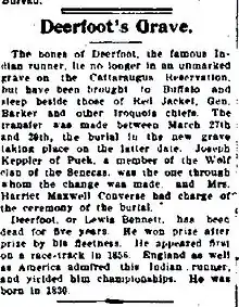 Deerfoot's obituary in The New York Times illustrated his worldwide fame during his lifetime, even though most of his feats took place in England and abroad.[10] Deerfoot's grave was moved in 1901, from an unmarked grave to his current resting place in Forest Lawn Cemetery in Buffalo, New York.[11]