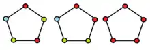 An example of defective colouring of a cycle on five vertices, , is as shown in the figure. The first subfigure is an example of proper vertex colouring or a (k, 0)-coloring. The second subfigure is an example of a (k, 1)-coloring and the third subfigure is an example of a (k, 2)-coloring. Note that,