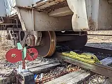 The most common form is a wedge-shaped piece of steel which fits over the top of the rail.[7] If a car or locomotive attempts to roll over it, the wheel flange is lifted over the rail to the outside, derailing it. When not in use, the derail folds away, leaving the rail unobstructed.[8] It can be manually or remotely operated; in the former case it will have a lock applied to prevent it from being moved by unauthorized personnel.[9] This type is common on North American railroads.[10]