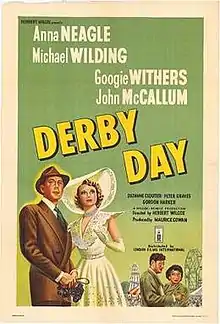 Derby Day is a 1952 British drama film directed by Herbert Wilcox and starring Anna Neagle, Michael Wilding, Googie Withers, John McCallum, Peter Graves, Suzanne Cloutier and Gordon Harker. An ensemble piece, it portrays several characters on their way to the Derby Day races at Epsom Downs Racecourse. It was an attempt to revive the success that Neagle and Wilding had previously enjoyed on screen together.[2] To promote the film, Wilcox arranged for Neagle to launch the film at the 1952 Epsom Derby.[3] In the United States, the film was released as Four Against Fate.