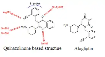 Alogliptin (Figure 9) is a novel DPP-4 inhibitor developed by the Takeda Pharmaceutical Company.[22] Researchers hypothesized that a quinazolinone based structure (Figure 9) would have the necessary groups to interact with the active site on the DPP-4 complex. Quinazolinone based compounds interacted effectively with the DPP-4 complex, but suffered from low metabolic half-life. It was found that when replacing the quinazolinone with a pyrimidinedione, the metabolic stability was increased and the result was a potent, selective, bioavailable DPP-4 inhibitor named alogliptin. The quinazoline based compounds showed potent inhibition and excellent selectivity over related protease, DPP-8. However, short metabolic half-life due to oxidation of the A-ring phenyl group was problematic. At first, the researchers tried to make a fluorinated derivative. The derivative showed improved metabolic stability and excellent inhibition of the DPP-4 enzyme. However, it was also found to inhibit CYP 450 3A4 and block the hERG channel. The solution to this problem was to replace the quinazolinone with other heterocycles, but the quinazolinone could be replaced without any loss of DPP-4 inhibition. Alogliptin was discovered when quinazolinone was replaced with a pyrimidinedione. Alogliptin has shown excellent inhibition of DPP-4 and extraordinary selectivity, greater than 10.000 fold over the closely related serine proteases DPP-8 and DPP-9. Also, it does not inhibit the CYP 450 enzymes nor block the hERG channel at concentration up to 30 µM. Based on this data, alogliptin was chosen for preclinical evaluation.[23] In January 2007 alogliptin was undergoing the phase III clinical trial and in October 2008 it was being reviewed by the U.S. Food and Drug Administration.[24]
