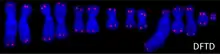 Tasmanian devil cells have 14 chromosomes; the oldest-known strain of the tumour cells have thirteen chromosomes, nine of which are recognisable and four of which are mutated "marker" chromosomes.[22] More recently evolved strains have an additional mutant marker chromosome, for a total of fourteen chromosomes.[23][24] Researchers identified the cancer as a neuroendocrine tumour, and found identical chromosomal rearrangements in all the cancer cells.[25] The karyotype anomalies of DFTD cells are similar to those of cancer cells from canine transmissible venereal tumour (CTVT), a cancer of dogs that is transmitted by physical contact.[25] Among the mutations present in the tumour genome is trisomy in chromosome 5p, as well as several single base mutations, and short insertions and deletions, e.g., deletions in the chromosomes 1, 2 and 3. Some of the mutated or deleted genes in DFTD are RET, FANCD2, MAST3 and BTNL9-like gene.[26]