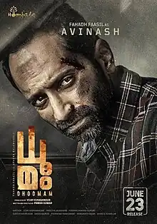Dhoomam (transl. Smoke) is an Indian Malayalam-language action thriller film[1] written and directed by Pawan Kumar.[3][4] The film was produced by Vijay Kiragandur under Hombale Films in their debut production in Malayalam cinema. It stars Fahadh Faasil and Aparna Balamurali, alongside Roshan Mathew, Vineeth, Anu Mohan, Achyuth Kumar, Joy Mathew and Nandhu. It was released on 23 June 2023 and opened to mixed reviews.[5]