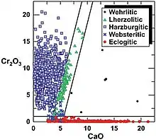 Chromium vs. Calcium content of various inclusions. Eclogite (i.e. garnet-bearing) inclusions in diamond contain less Cr2O3 whereas peridotite (lherzolite and harzburgite) garnet inclusions have less CaO. Eclogite and peridotite are the two main parental mantle rocks and wehrlite and websterite are minor types.[1][2][3]