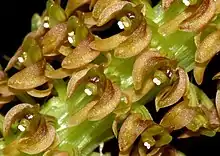 Dienia ophrydis, commonly known as the common snout orchid[2] or 无耳沼兰 (wu er zhao lan)[3] is a plant in the orchid family and is native to endemic to a broad area of Asia, Southeast Asia, the Philippines, New Guinea and northern Australia. It is a deciduous, terrestrial orchid with a cone-shaped stem, bright green, wavy leaves and many greenish, brown, reddish or purplish flowers crowded on a wiry flowering stem.
