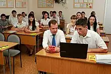 As a child, Medvedev was intellectually curious, described by his first grade teacher Vera Smirnova as a "dreadful why-asker". After school, he would spend some time playing with his friends before hurrying home to work on his assignments. In the third grade, Medvedev studied the ten-volume Small Soviet Encyclopedia belonging to his father.[11] In the second and third grades, he showed interest in dinosaurs and memorised Earth's primary geologic development periods, from the Archean up to the Cenozoic. In the fourth and fifth grades he demonstrated interest in chemistry, conducting elementary experiments. He was involved to some degree with sport. In grade seven, his adolescent curiosity blossomed through his relationship with Svetlana Linnik, his future wife, who was studying at the same school in a parallel class.[11] This apparently affected Medvedev's school performance. He calls the school's final exams in 1982 a "tough period when I had to mobilize my abilities to the utmost for the first time in my life."[10][13]