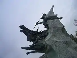 Don Quixote depicts a bronze and stone figure of Don Quixote wearing a full suit of armor riding his horse Rocinante which emerges from a jagged piece of stone.[1] The jagged stone is Colmenar stone from Pamplona. Only the front portion of Don Quixote and his horse are visible. The horse appears to be charging forward out of the stone with his head raised, mouth open, and hooves kicking. The left foot of the horse is not formed, intentionally, by Teno. In Don Quixote's hand is a 12 feet (3.7 m) lance of steel. Both figures are loosely modeled and the figures and stone rest on a 66 short tons (60,000 kg) oval base measuring 4 by 5 by 12 feet (1.2 m × 1.5 m × 3.7 m) which was cut into three pieces for transport by ship to the United States.[2]