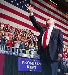 While previous presidents had held rallies in the early days of their presidency to garner support for legislation, such rallies differed from Trump's in that they were funded by the White House rather than by campaign committees.[41][42] One of the advantages of having his campaign committee fund the events is that organizers can more discriminately screen attendees, refusing entry to non-supporters.[43] Trump's February 2017 rally in Melbourne, Florida, was the earliest campaign rally for an incumbent president.[44][45]