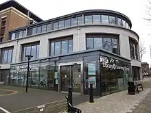 The catchment population for major food retail outlets in Dorchester is 38,500 (2001 estimate) and extends eight miles west, north and east of the town, and two miles south.[59] The Brewery Square redevelopment project now includes retail outlets, residential units, bars, restaurants, hotel and cultural facilities. The regeneration of Dorchester South railway station will make it the UK's first solar powered railway station.[60] The Charles Street development has had a first phase completed that includes a library and adult education centre for Dorset County Council, and offices for Dorset Council. Future phases are planned to include 23 shops, an underground car park, hotel and affordable housing. The second phase has attracted funding of £4 million from the former West Dorset District Council and includes new Marks & Spencer and Waitrose stores.[61]