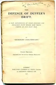 The Defence of Duffer's Drift was published in 1904 when Swinton was a field officer in the British Army. It appeared in the British United Service Magazine under the pseudonym, Lieutenant N. Backsight Forethought ("BF"), who is the narrator of the book. The book is an exploration of small unit tactics in a fictional encounter in the Second Boer War. Swinton was a captain of the Royal Engineers in South Africa during the Boer War,[2][3] and the book "embodies some recollections of things actually done and undone in South Africa, 1899–1902."[4]