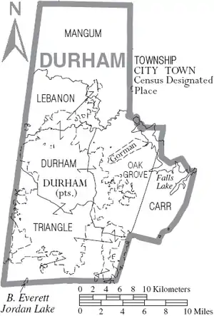 Durham County is a county located in the U.S. state of North Carolina. As of the 2020 census, the population was 324,833,[1] making it the sixth-most populous county in North Carolina. Its county seat is Durham,[2] which is the only incorporated municipality predominantly in the county, though very small portions of cities and towns mostly in neighboring counties also extend into Durham County. The central and southern parts of Durham County are highly urban, consisting of the city as well as several unincorporated suburbs. Southeastern Durham County is dominated by the Research Triangle Park, most of which is in Durham County. The northern third of Durham County is rural in nature.