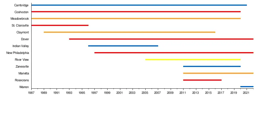 After the 1996 season, St. Clairsville dropped out. Indian Valley High School left the PAC-7 to replace St. Clairsville for the 1996-97 school year.[1] A year later New Philadelphia left the Federal League and joined. The next addition was River View, which fully completed a transition to the East Central Ohio League from the Muskingum Valley League in 2005.[2]