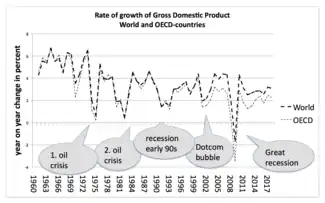 Mansell and Wehn state that economic development has been understood by non-practitioners since the World War II to involve economic growth, namely the increases in per capita income, and (if currently absent) the attainment of a standard of living equivalent to that of industrialized countries.[6][7] Economic development can also be considered as a static theory that documents the state of an economy at a certain time. According to Schumpeter and Backhaus (2003), the changes in this equilibrium state documented in economic theory can only be caused by intervening factors coming from the outside.[8]