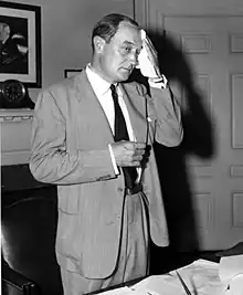 As president, Truman appointed him United States representative to the Allied Reparations Committee from 1945 to 1947. With the rank of ambassador, as well as industrial and commercial advisor to the Potsdam Conference, his chief task was to renegotiate the reparations agreements formulated at the Yalta Conference (many of which affected eventual C.I.A. director Allen Dulles's former clients). When Truman tried to appoint him Under Secretary of the Navy in 1946, Secretary of the Interior Harold L. Ickes resigned in protest, claiming that while Pauley was treasurer of the Democratic National Committee, he had suggested to Ickes that $300,000 ($4.99 million in 2024 dollars) in campaign funds could be raised if the Interior Department would drop its fight against the State of California for ownership of oil-rich offshore lands.[4][5][6][7] Ickes's resignation scuttled the appointment, and Pauley worked behind the scenes thereafter.